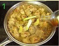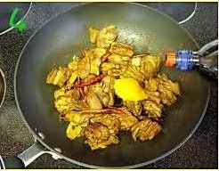 加入沥干水份的羊排煸炒,喷入少许料酒;