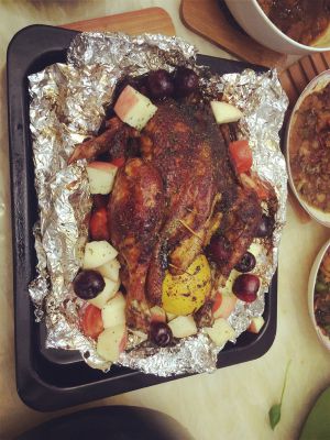 出炉后,把苹果块、车厘子、圣女果撒在烤鸡周围,然后撒上迷迭香,大功告成。外脆里嫩的烤鸡就做好啦。