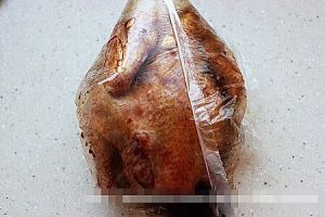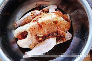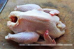 三黄鸡洗尽,去除内脏、鸡头、脖子、屁股(从屁股那开个拳头大小的洞,鸡肚子不要破开)