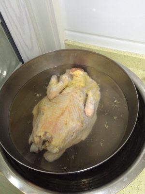 在鸡的表面均匀的撒上食用盐,然后用牙签在鸡身上扎几个孔(方便入味),倒入淹没鸡身的水,浸泡20小时。