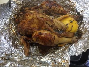 打开锡纸,再把刚刚生抽老抽混合的酱料涂抹一层在鸡表面。然后把鸡敞开放入烤箱,180度烤30分钟。