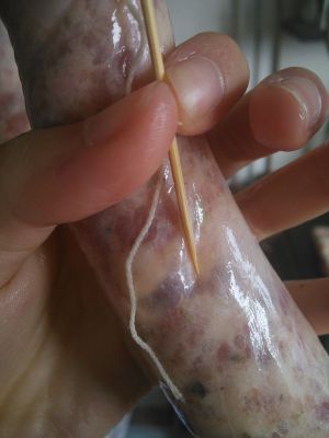 一直到所有的肉都塞进去,尽量塞鼓一点,端头打结