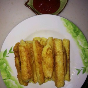 放入沾满蛋液的馒头条煎熟即可。