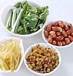 备好小油菜,榨菜,油炸花生米,酸豆角,香菜,香葱等材料,鸡蛋提前煮熟去壳。