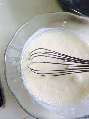 打发淡奶油,没有电动搅拌器只好用普通的打蛋器,锻炼肌肉咯~