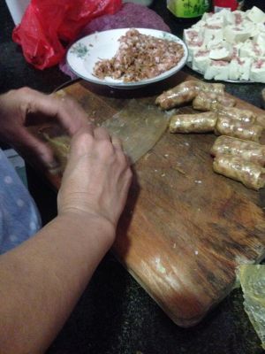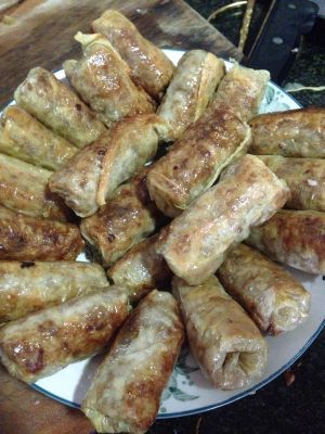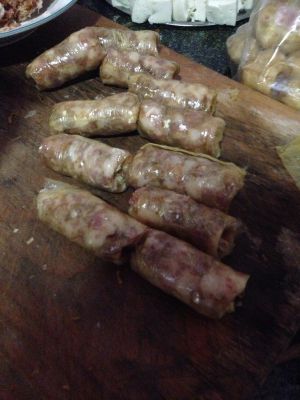 把腐衣剪成一小片(主要看起来精致)然后加肉一起卷
