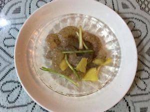 虾仁加盐酒葱姜腌制后加淀粉拌匀