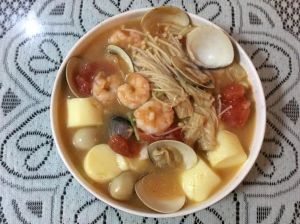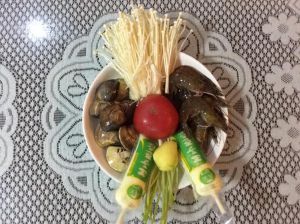 加油放葱姜爆香去葱姜留油,把番茄炒一下,加水烧开后加入焯过水的金针菇和蛤俐,等水再开后加豆腐和虾仁稍煮加入盐味精勾芡起锅