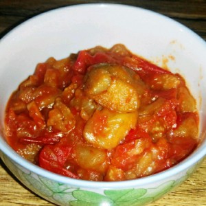 茄子切小块的滚刀块,用少许盐腌制半小时,再挤干水分,番茄切块