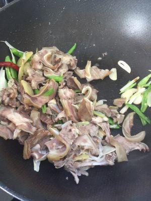 葱姜蒜爆锅后加入切好的羊头皮翻炒