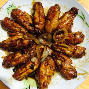 依次倒入老抽,料酒,可乐,少许盐,糖,葱(锅里的洋葱是我昨天炸洋葱圈剩的,不能浪费,扔锅里提味,哈哈)中火收汁