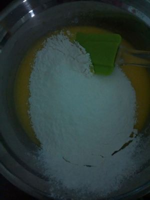 高粉和玉米淀粉混合过筛倒入蛋黄里搅拌均匀~