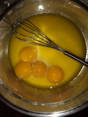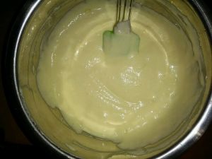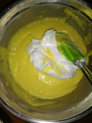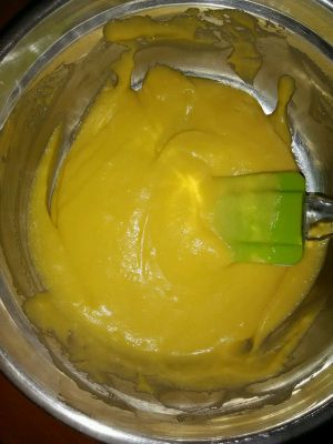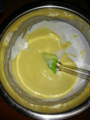 取一部分打发好的蛋白糊到蛋黄糊里~切拌均匀~