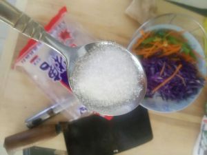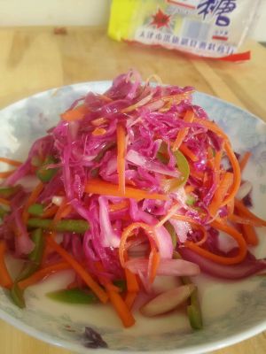 醋和糖熬3-4秒,把菜都倒在锅里翻炒均匀关火,放点盐,放点鸡精,鸡精用碗倒入温水化开倒入锅中搅拌均匀出锅,酸甜口