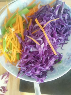 锅中烧水,水开先把胡萝卜和青椒放在一起烫不要关火停个十多秒捞出,在把紫甘蓝放在锅中停5-6秒马上关火捞出备用