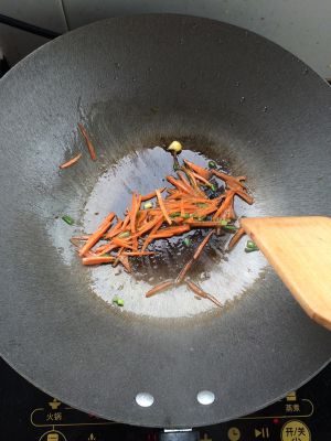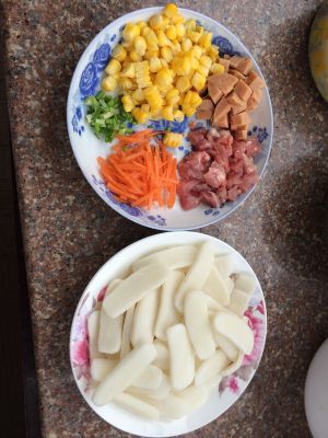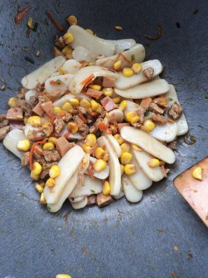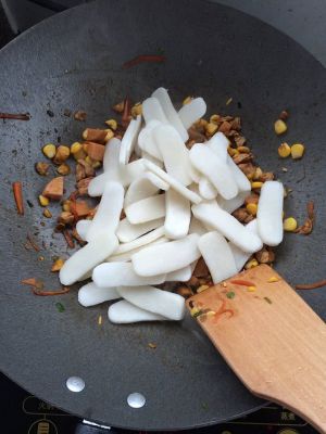 将切好的年糕放入锅中,翻炒过程中分几次加水,保证年糕软糯和不粘锅。