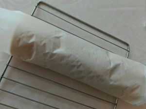 拿出来后可以在不烫手的前提下松松的卷一下,再摊开晾凉然后涂抹奶油等。这样开始就松松的卷一下,会让后面卷紧的时候蛋糕卷不会开裂