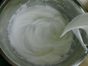 蛋白里分三次加入总共约22.5克的细砂糖,低速慢打至提起打蛋器,蛋白呈弯钩状,也就是八九分的样子