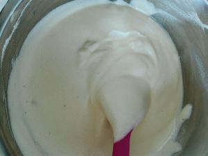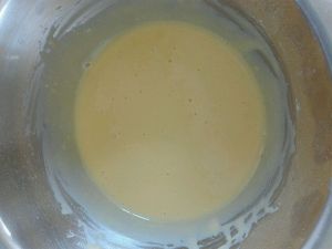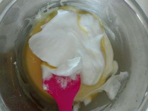 再将拌好的蛋黄糊倒入蛋白霜里,再次切拌均匀即可