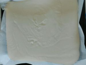 烤盘事先铺入油纸,将做好的蛋糕糊倒入烤盘里,轻轻晃动使之均匀铺满烤盘