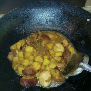 把红烧肉放进去小火焖20分钟左右(中间也要翻一翻),收汁,关火不揭锅盖捂着。10分钟后可以盛起来。土豆软粉+红烧肉汁香,美味!(儿子说想吃卤蛋,加2个蛋一起焖)