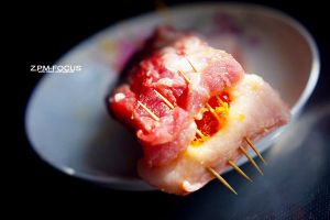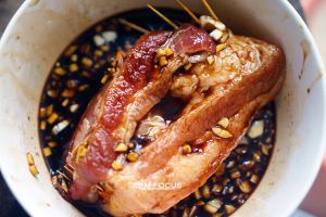 将生抽、蚝油、蜂蜜、料酒、蒜蓉姜末混合成叉烧汁把酿好的五花肉放入,放冰箱冷藏腌制三个小时入味。有时间可以腌制久一点。