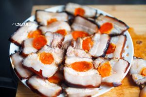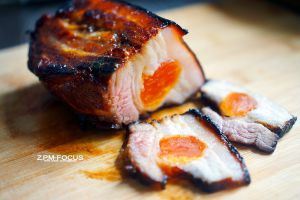 用干净的剪刀从五花肉的一端往里剪一些肉出来,挖一个长长的洞,把咸蛋黄一个个酿进去。酿好的五花肉用牙签把那个小口封起来,不让咸蛋跑出来。