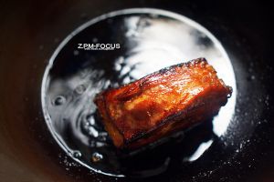 锅里放入一碗油,烧至七成热,放入腌制好的五花肉,小火煎十五分钟,在煎的过程中要不断地翻。
