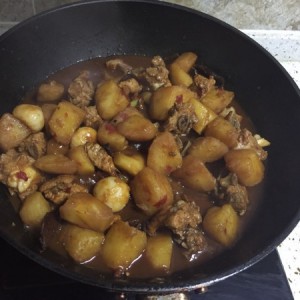 加水烧一会儿 再倒入土豆 大葱节 和适量老抽 盖上锅盖 中火焖烧大概15-20分钟
