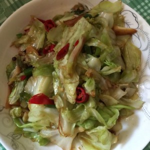 油热后放 姜蒜干辣椒爆香 放入包菜 放调味料 盐 生抽 翻炒 最后放入鸡精 出锅