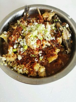 炒锅洗净,倒入油烧至九成热后浇在表面,最后把剩下的葱花撒上去。香辣可口的‘口水黄辣丁’就做好了。