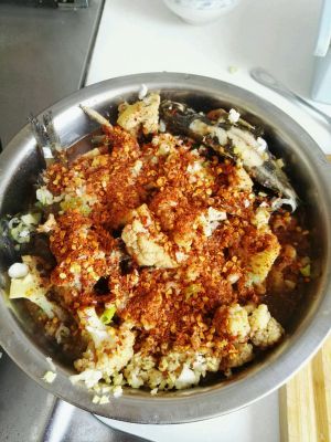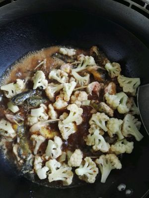 待黄辣丁变色后放入汆好的洋花菜继续煮5分钟左右,时间短了花菜不入味,时间长了黄辣丁煮烂了。