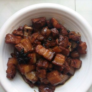 把五花肉洗净,切成4厘米左右的方块。冷水下锅开始煮,煮开之后把上面油花去除,把肉捞出来,肉汤留着备用。