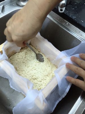 用漏勺把絮絮放入豆腐模里,摊平