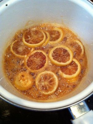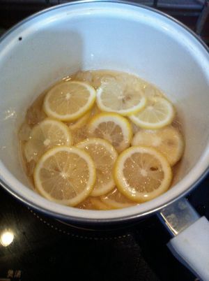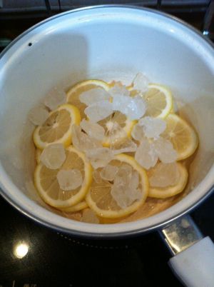 柠檬用盐搓表面,然后冲洗干净,切成片铺在锅底,上面放冰糖,倒一点水防止糊锅