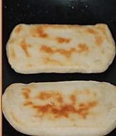 锅里抹少许油,放饼小火煎至两面金黄即可。做好的饼中间切开,塞上切碎的肉与青椒。浇少许肉汤。