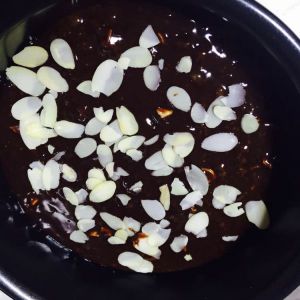 倒入6寸圆模,轻震去泡,放入杏仁片装饰