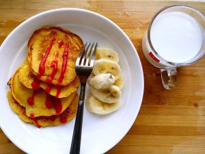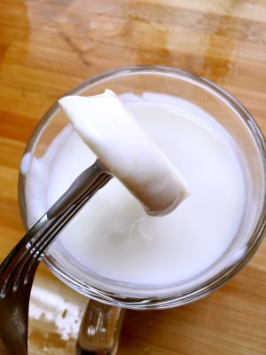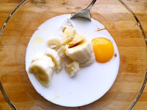鸡蛋,牛奶,半根香蕉,一勺蜂蜜搅碎,捣匀