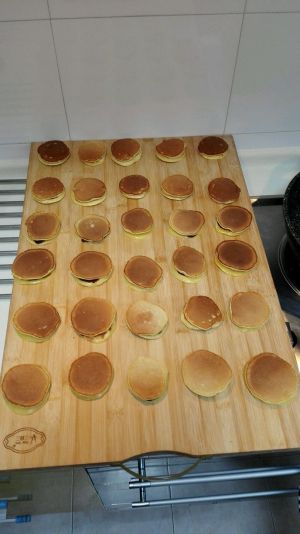 面饼全部做好后,取两个出来,中间夹上豆沙馅儿,用手掌轻轻地压一下就可以了。(热的时候最好吃。)