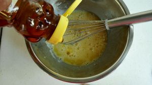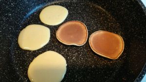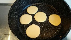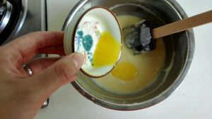 将锅子烧热,再转成小火,揺一勺拌好的鸡蛋面糊在锅子里。