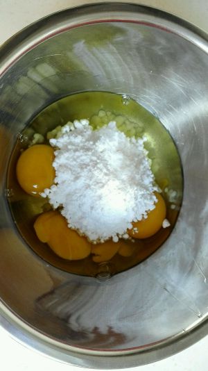 将鸡蛋打入到干净无水的盆里,再加入糖粉,搅拌均匀。