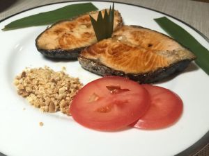 煎好后摆盘,在三文鱼上淋一点鱼露,有柠檬片的话也可以挤几滴柠檬汁。前几天做甜甜圈还剩了点花生碎,也用上吧,没想到三文鱼沾花生碎还真好吃耶。