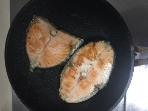 三文鱼放油锅,两面煎黄。不要大火,中火就好了。