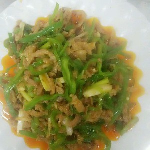 加入青椒,大葱,姜丝,蒜粒翻炒调味鸡精起锅