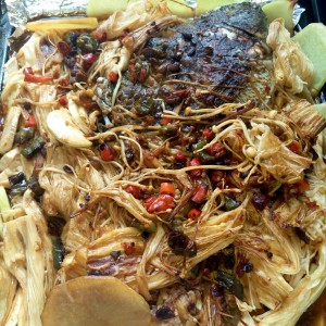 罗非鱼一条,洗干净,摸点盐在鱼身上,再淋上料酒,腌制一个小时