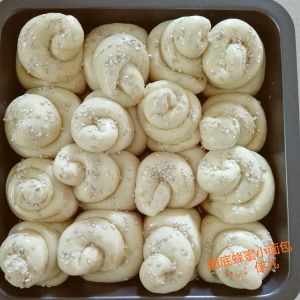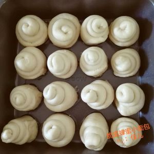 面卷整齐的摆放在烤盘中,在烤箱里放一碗热水,放入烤箱中进行第二次发酵。