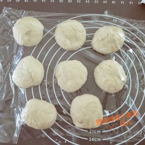 发酵好的面团松弛排气后平均分成八份,滚圆盖保鲜膜松弛15分钟。