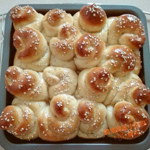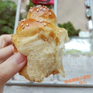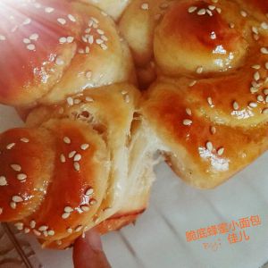 烤盘放入预热好的烤箱中层,180度烤20分钟左右即可。出炉的面包表面刷蜂蜜水后立刻将面包脱模至冷却架冷透。
