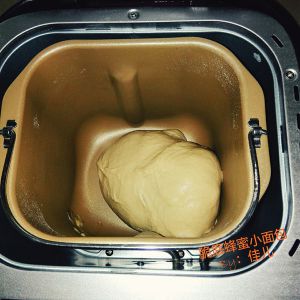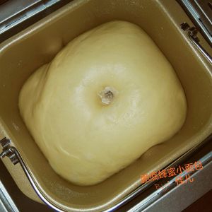 除了黄油以外,所有面团材料放入面包机,面粉挖洞把酵母埋好,启动面包机和面程序,30分钟后加入软化好的黄油,继续和面揉到完全阶段。