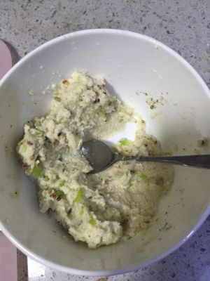 先把豆渣面粉葱末放进去搅拌,这个程度的豆渣有些多,煎的时候会散,需要再加面粉